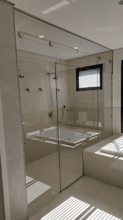 Sistema com portas de correr desenvolvido com estrutura em aço inox 304, oferecendo alta resistência à corrosão e excelente durabilidade. Compatível com vidro temperado de 8 mm, o projeto conta com roldanas instaladas sobre corte no vidro, proporcionando um acabamento superior e um elegante efeito visual flutuante. Trata-se de uma solução moderna e funcional, ideal para banheiros residenciais e corporativos, com acabamentos sofisticados que valorizam o ambiente e elevam o padrão estético do espaço.