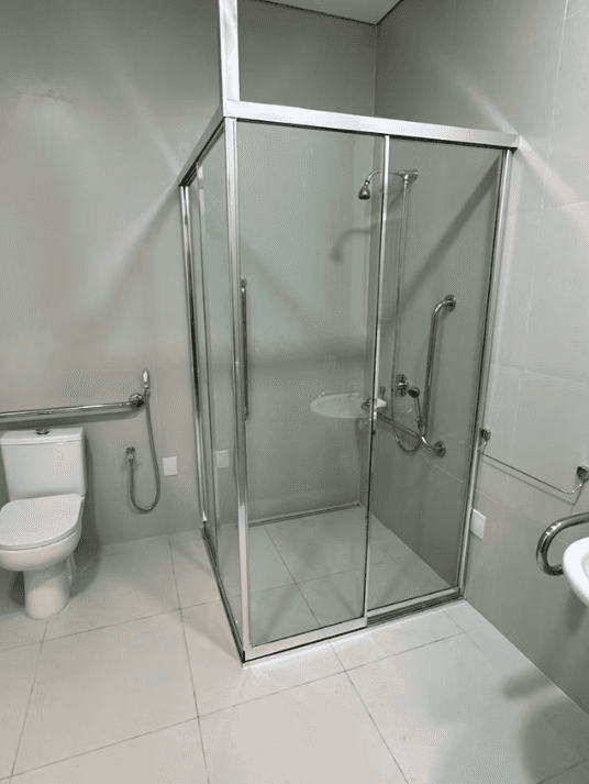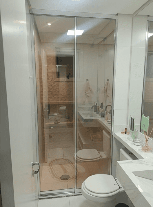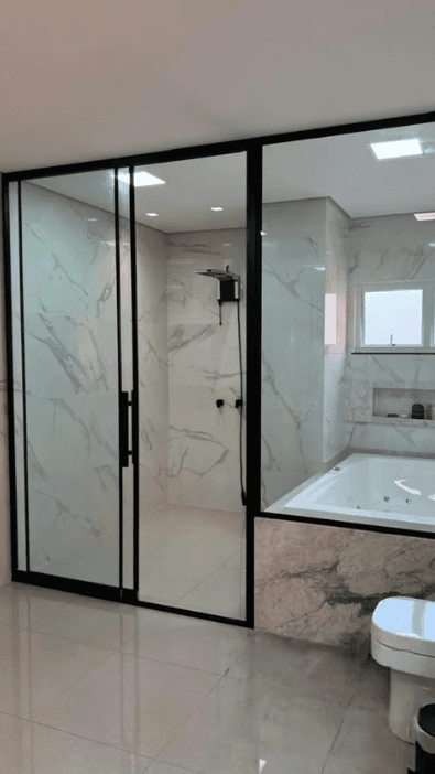 Compatível com vidro de 10 mm, podendo ser laminado ou temperado (espessura de 10,2 mm), o sistema permite altura máxima de até 3.000 mm por painel e largura variável entre 500 mm e 1.500 mm. Todas as folhas são móveis, garantindo maior amplitude e facilidade de uso. Conta com vedação em alumínio com efeito sauna, oferecendo proteção eficiente contra água e vapor, além de perfil de vedação entre os vidros para maior estanqueidade. O sistema não necessita de recorte no vidro e utiliza trilho inferior com apenas 20 mm de altura, possibilitando aplicação embutida e acabamento mais discreto. Possui batente superior de segurança que impede o desencaixe das folhas, roldanas inferiores em aço inox 304 com regulagem para ajuste preciso e proporciona uma instalação rápida e limpa.