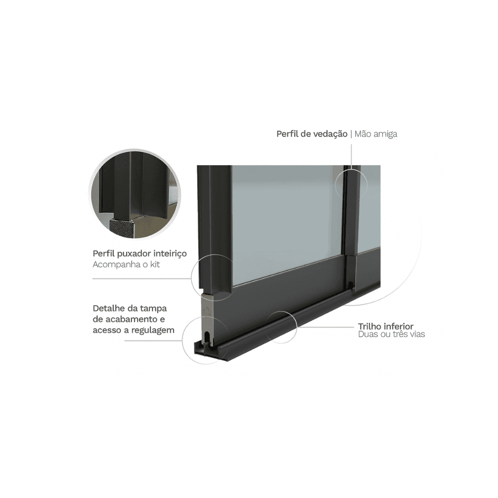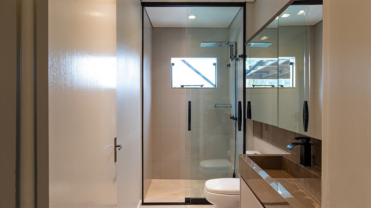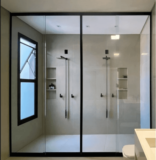 A largura por painel varia de 500 mm a 1500 mm, com todas as folhas móveis, garantindo maior amplitude de abertura e facilidade na limpeza. A vedação em alumínio com efeito sauna protege contra água e vapor, enquanto a instalação sem recortes no vidro preserva a estética e a integridade do material. O trilho inferior de apenas 20 mm de altura permite aplicação embutida, oferecendo um visual mais clean. Já o batente superior de segurança impede o desencaixe das folhas, proporcionando maior proteção. Para completar, o perfil de vedação entre os vidros aumenta a estanqueidade, e todo o sistema conta com instalação rápida e limpa, ideal para projetos que exigem eficiência e acabamento impecável.