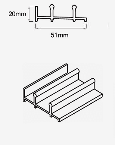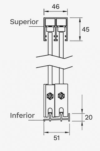 Roldanas em inox 304 com regulagem de 8 mm garantem fluidez e segurança. Peso concentrado no trilho inferior (20 mm de altura), com possibilidade de embutimento.